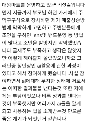 | 청년상인 AI활용 역량강화 교육은 어떤 변화 를 만들었을까?수강생 후기로 보는 현장 중심 AI 교육의 실제 효과 (0) | 2026.02.03 |