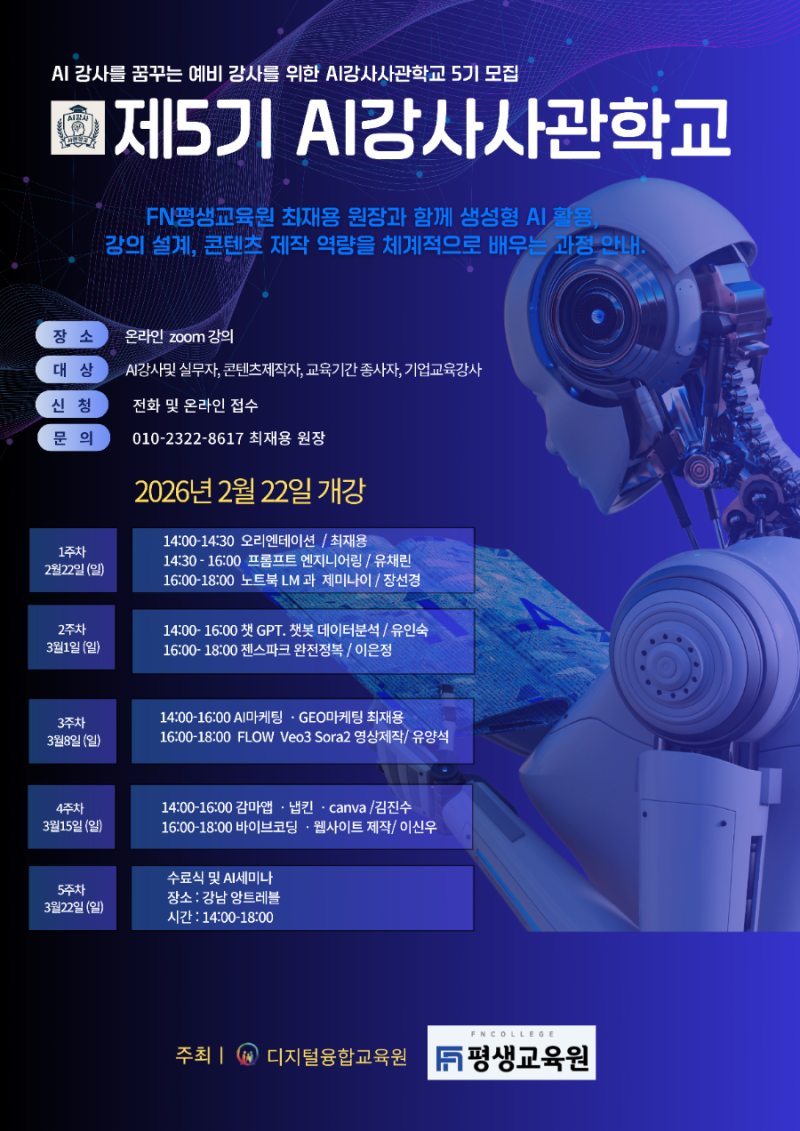 생성형 AI 시대, 강사의 경쟁력은 AI를 활용해 강의를 설계하고 콘텐츠를 제작하는 능력에서 결정됩니다. 디지털융합교육원이 운영하는 제5기 AI강사사관학교가 2026년 2월 22일 개강하며, 프롬프트 엔지니어링부터 ChatGPT, GEO마케팅, AI 영상 제작, 바이브코딩까지 실무 중심 5주 완성 커리큘럼으로 진행됩니다.