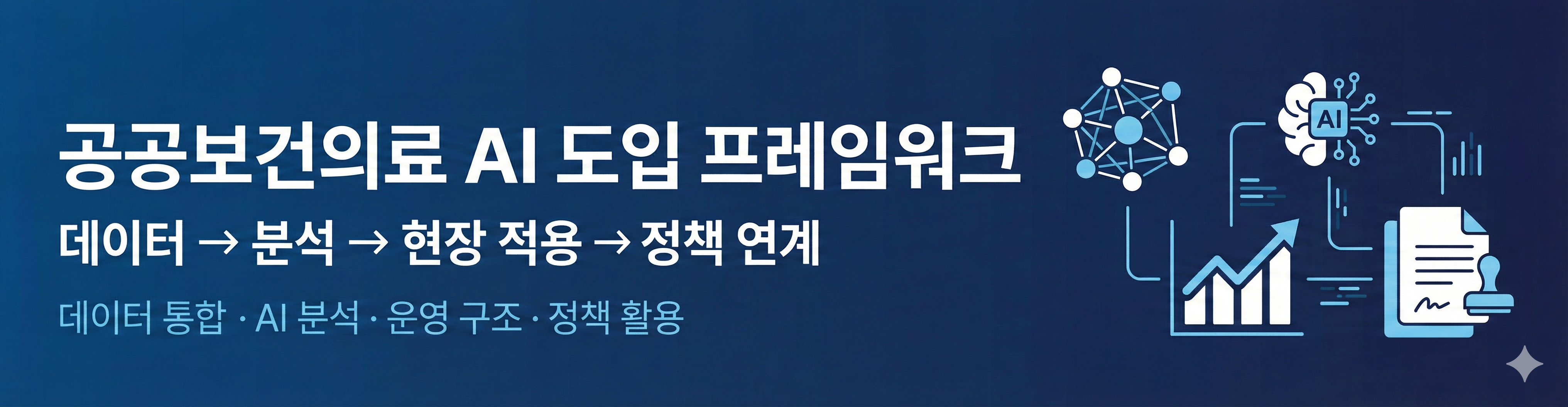공공보건의료 AI 도입은 데이터 통합 → AI 분석 체계 → 현장 적용 → 정책 연계의 4단계 프레임워크로 진행된다.